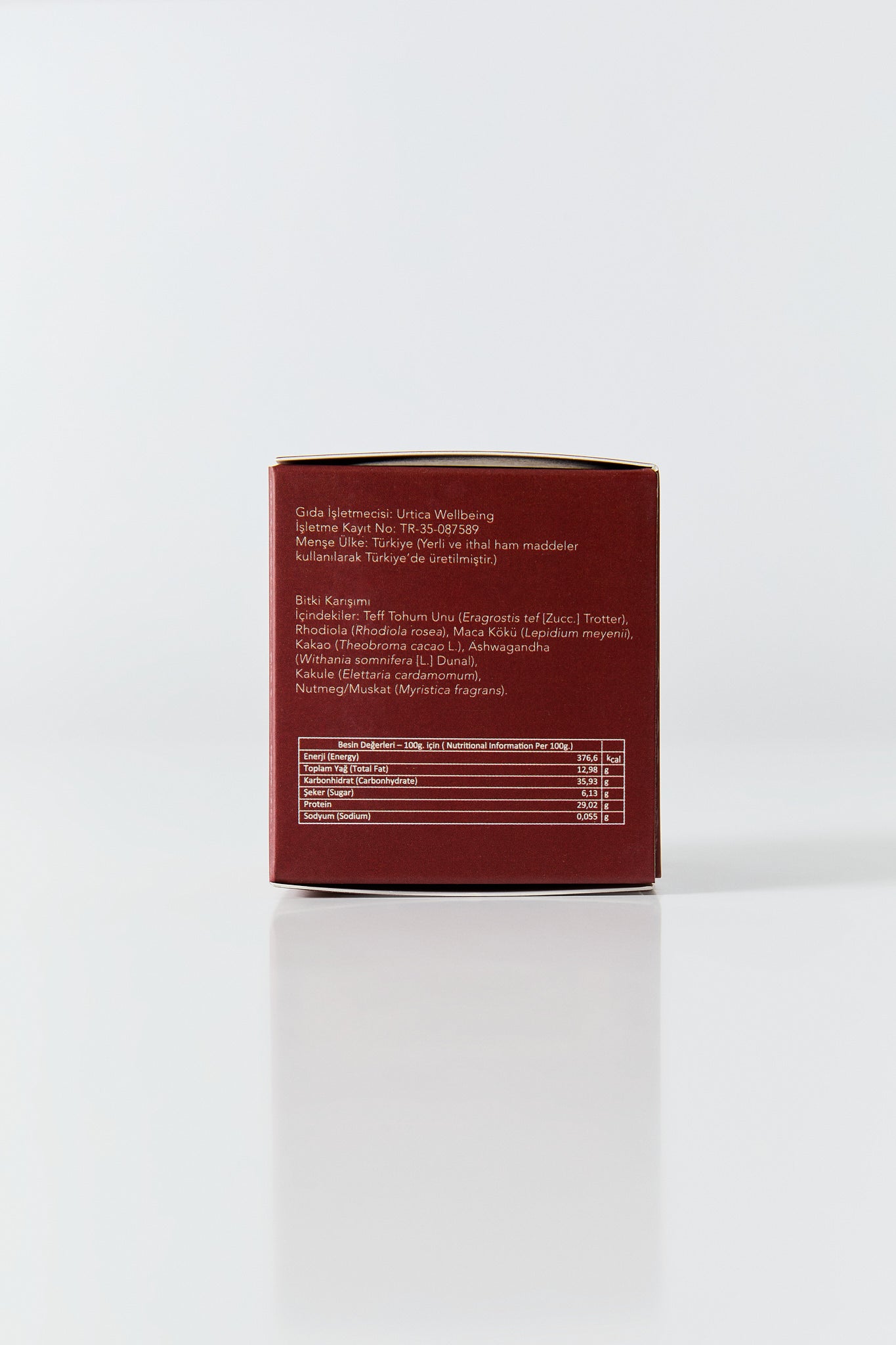 Teff Seed Flour, Raw Cacao, Ashwagandha, Rhodiola Rosea, Maca Root, Nutmeg, Cardamom.