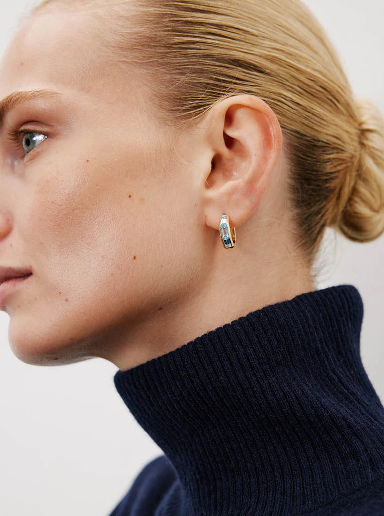 The geometrical design codes of the collection are highlighted with sparkling gems in striking colors and contrasting cuts in angular and rounded forms, giving a dynamic and playful character to the designs.'' Defne, the creative director of Fidelle.