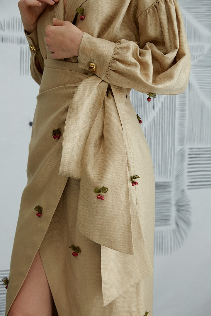 Envelop midi skirt with cherry needle laces in truffle.