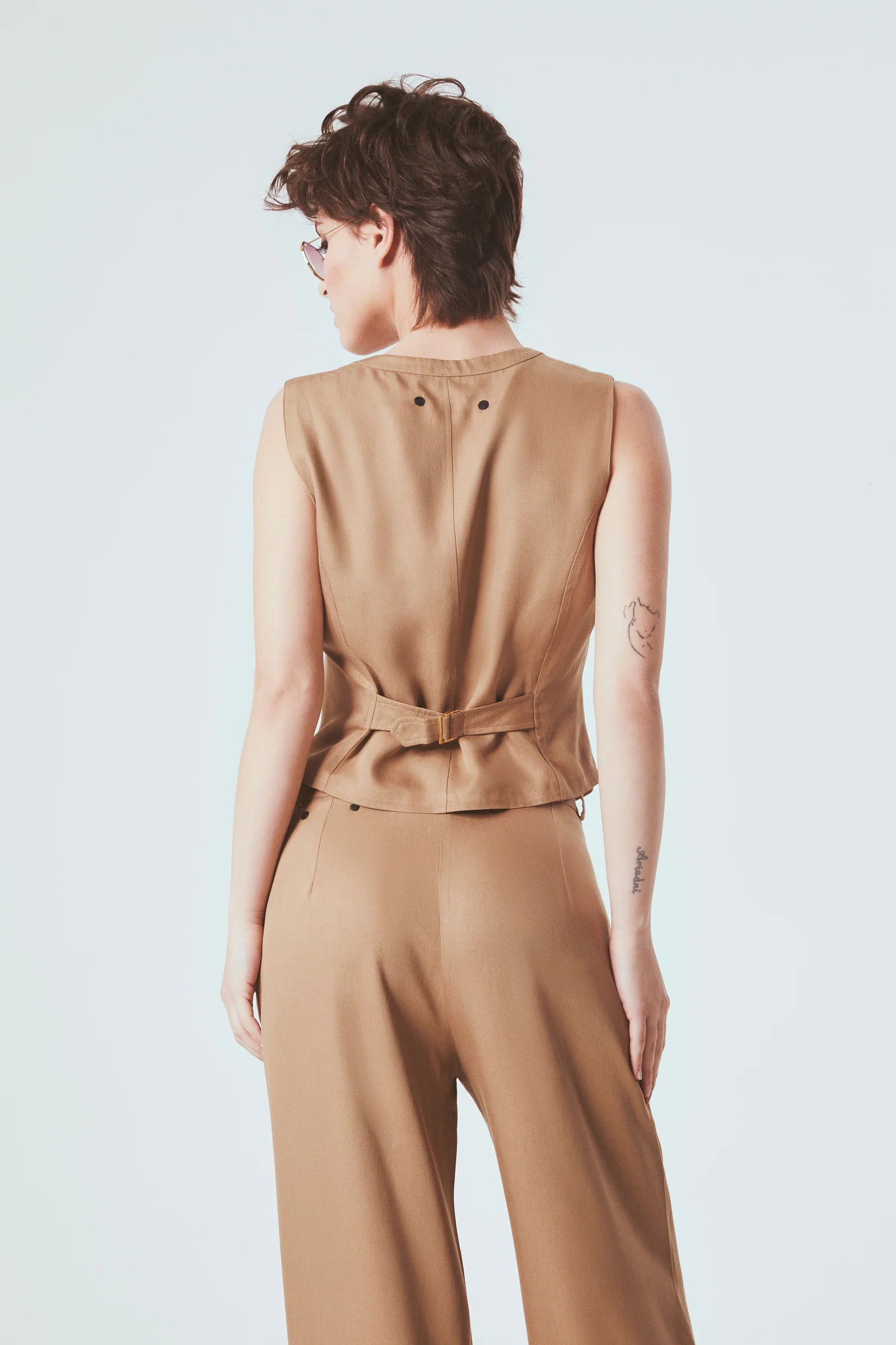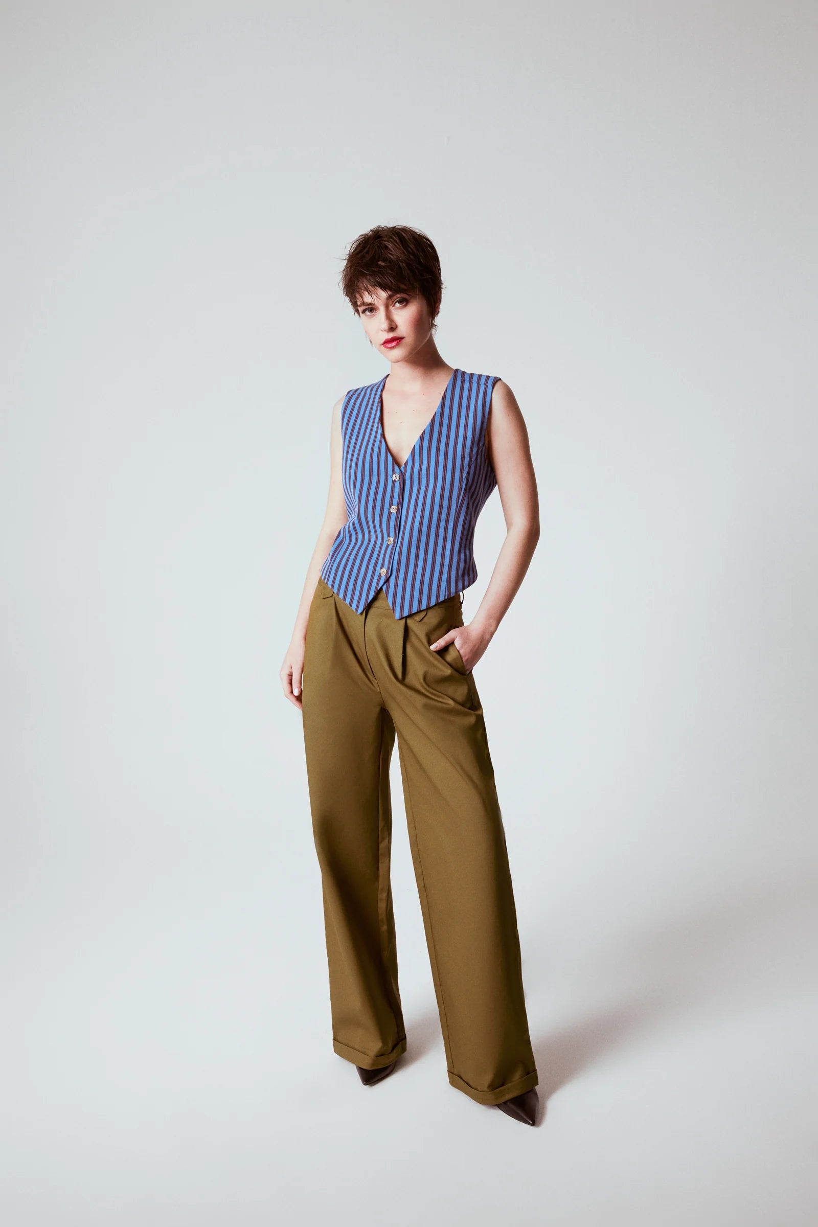 Loose and comfortable form with its mid-rise waist, front pleats, side pockets and wide legs.